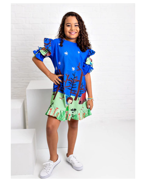 Vestido azul com uma estampa alegre e delicada do conto: da chapeuzinho vermelho, em tecido de crepe, look com ótimo caimento e leveza, tem um pequeno babado na barra dando mais fluidez ao vestido, as mangas com estilo princesa possui um detalhe com babado e regulagem por amarração deixando a peça ainda mais delicada. Uma peça versátil, com uma amarração na parte de traz para facilitar quando for vestir e pode ser usado dos dois lados deixando a criançada pronta para qualquer ocasião.